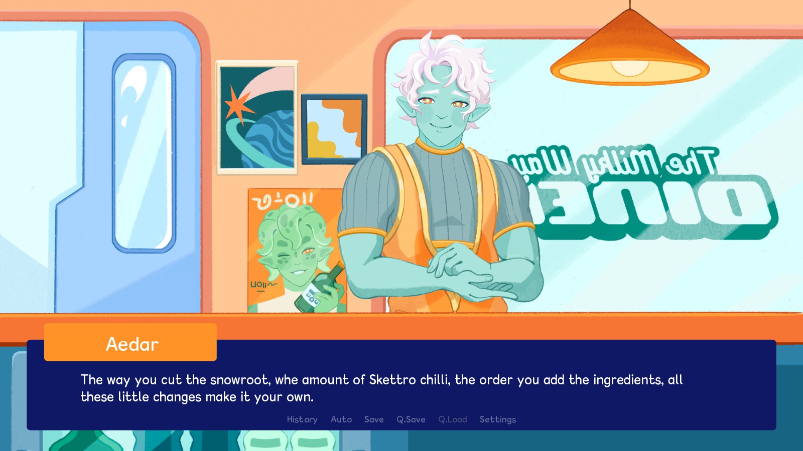 Ka’el leads you to get checked into the station and you meet the next LI, Officer Shiwoo where you learn some more about the station as he makes sure you aren’t carrying any weapons or illegal material. Though, you may have embarrassed yourself by passing out and you’re sent to the next two Lis, Saria the head Physician who tends to you and Vega. Saria is busy so you don’t get to interact with her much, though you do learn how kind she is, but you do get to interact with Vega more. Vega was being treated as you walk in and, well, it turns out her vessel may have exploded a bit and she was barely able to be rescued. She’s thankfully fine now and she’s going to be here for a while as she waits for her ship to be fixed. You also learn some lore about this game’s world as you talk to her and even though her species and your species has had some bad blood between them, Vega seems like a delight (and she maybe thinks the same about you). As you enter your diner and get acquainted with it, you also meet another LI, Aedar, who’s a farmer on the agricultural deck and who will bring in produce for your diner. You can even have a little taste test event as all but tomatoes are from other star systems. You even give him the honor of getting the first dish from you, as you want to cook him lunch as thanks. This is where you learn that while you don’t have experience working in the food industry, let alone handling your own establishment, you do love cooking for others and it makes you happy seeing other people enjoying what you made. And Aedur shares the same sentiment, except happy that the plants he cares for helps feed the community. As you drop by where you’ll be sleeping, you meet your neighbors, Roswell the mechanic and Setteth the researcher. You get a cute little welcome gift (love it) and even learn one of the alien customs. And finally, you meet the last LI, La’ro the owner of the bar you get invited to, as it turns into an impromptu welcome party for you. La’ro further helps you know about the various different alien foods and how important it is to take the customer’s species into account, while also becoming your friendly rival. And, well, that’s it.