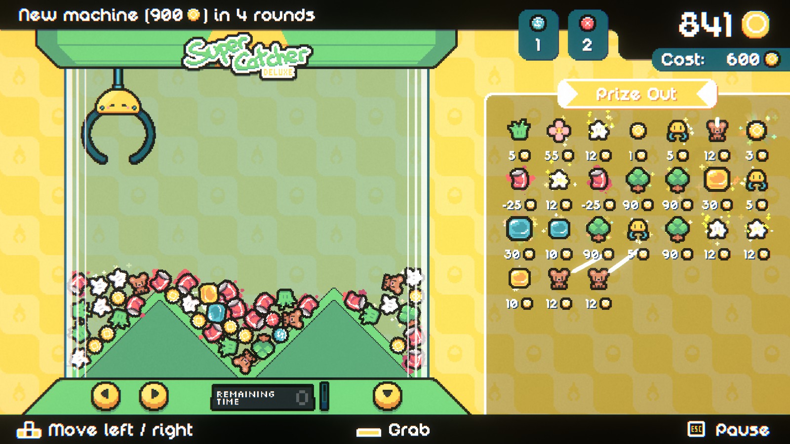 After every round, the machine will be emptied and refilled with new prizes. After 5 rounds with a machine, it’ll be switched out with a new one. A new machine brings a new floor layout, a penalty prize either being upgraded or a new one being added, a possible added effect inside the machine, and the cost being increased. The added effects I was able to see was bouncing floors and water-filled machine making all the pizes float around.