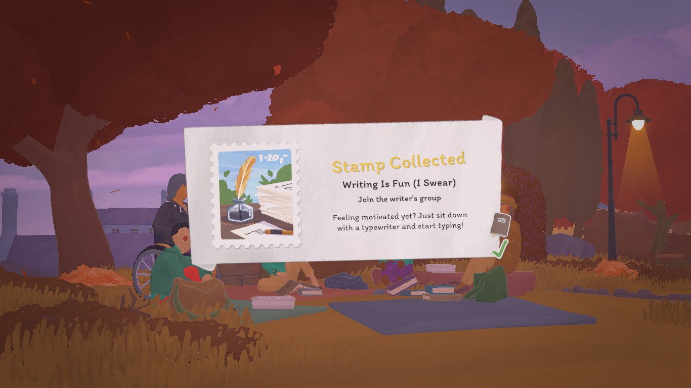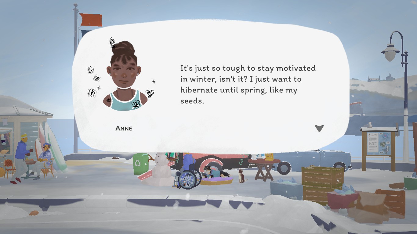 While I do like cozy games, I’m someone that needs some difficulty and goals and Tiny Bookshop does that in spades. This could have easily been a game that was really simple and easy, like it first seems, but it exceeds your expectations. The different effects you’ll be dealing with and how each location (and story character) has book genres they prefer really bring in that slight difficulty. You also most likely will run into situations where you’re low on a genre, putting another layer to your decision on where you want to go that day, and manage your money as you juggle daily expenses + travel, buying books to stock your shelves, and buying items you want. As while your trailer itself doesn’t upgrade, you do get access to a ton of different items to decorate your trailer all giving different effects. You can just decorate your bookshop however you want, I know I did, but you can outfit it based on where you’re going, the season, or an event. I loved decorating here by the way. Not to mention how packed it is with stamps, or quests, which give you a lot of goals to work towards. They all may just be going to a location, selling books, talking to characters, and exchanging items on paper (now that I think about it…some questlines have the same outline), but while playing they all felt different. I think that’s thanks to the help of the writing, the stories tied to them, and how you’ll have multiple quests going at the same time (and most likely at different points). Plus, it’s obvious everything would be tied to selling books. I was also pleasantly surprised with how this game has events (both small ones like weekly flea markets to big ones like holidays) and how Bookstonbury changes as you progress. There is so much to do here and Tiny Bookshop also somehow makes it not feel so overwhelming. Probably thanks to the game not having pressure aside from some seasonal-based events and quests, letting you take your time, and pacing everything out well as you won’t have access to everything right out the gate. It also definitely helped that none of the stamps/quests here seems to be missable. There’s no time limited quests* and you can take your time getting around to starting the questline, progressing it, and finishing it. Even if it means needing to wait a whole year so you’re in the right season.