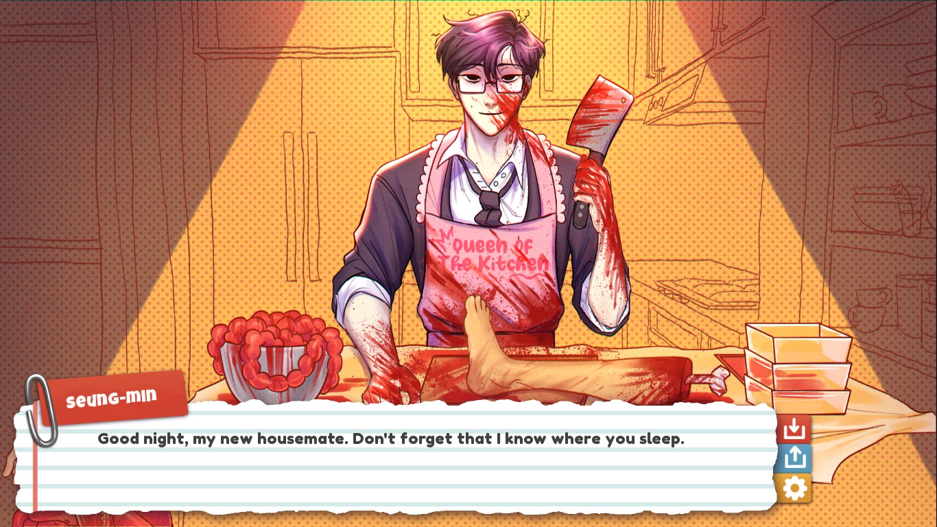 However, the truth had to come out at some point and of course your luck had to have a catch to it. That very same night you signed the contract you learned the truth about Seung-min in possibly the worst way you could have. He’s a cannibal and you just walked into him butchering his latest victim. How will you proceed know this and…how will he proceed now that his secret is out?