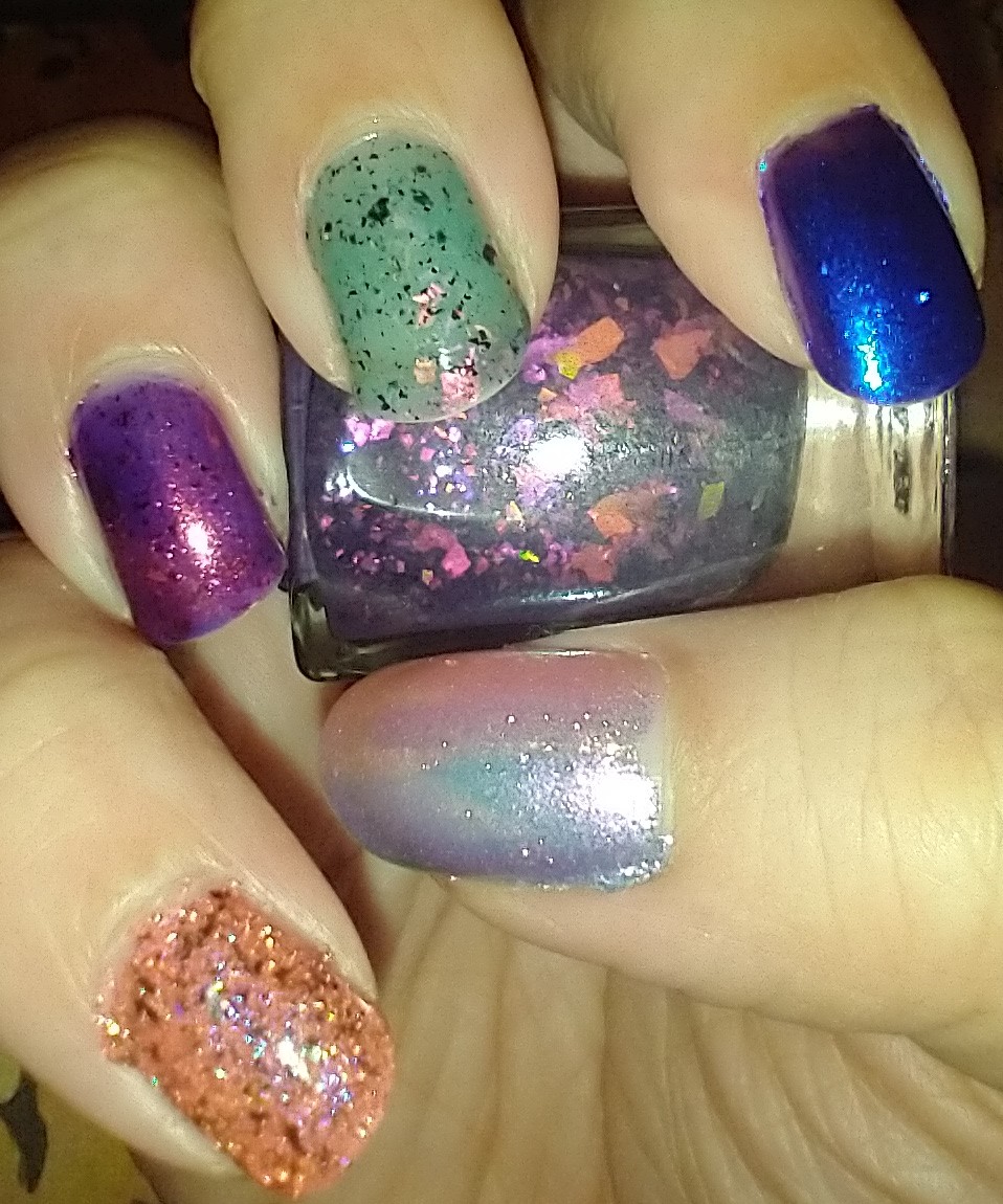 Well, those are my Top 5 nail polishes with a…pretty long honorable mention list. Now all that’s left is to look at the picture I took of my own nails wearing these polishes in a skittle mani! I wish I knew how others take pictures of their nails cause trust me, they look way better in person and I was not able to capture the depth of the polishes.