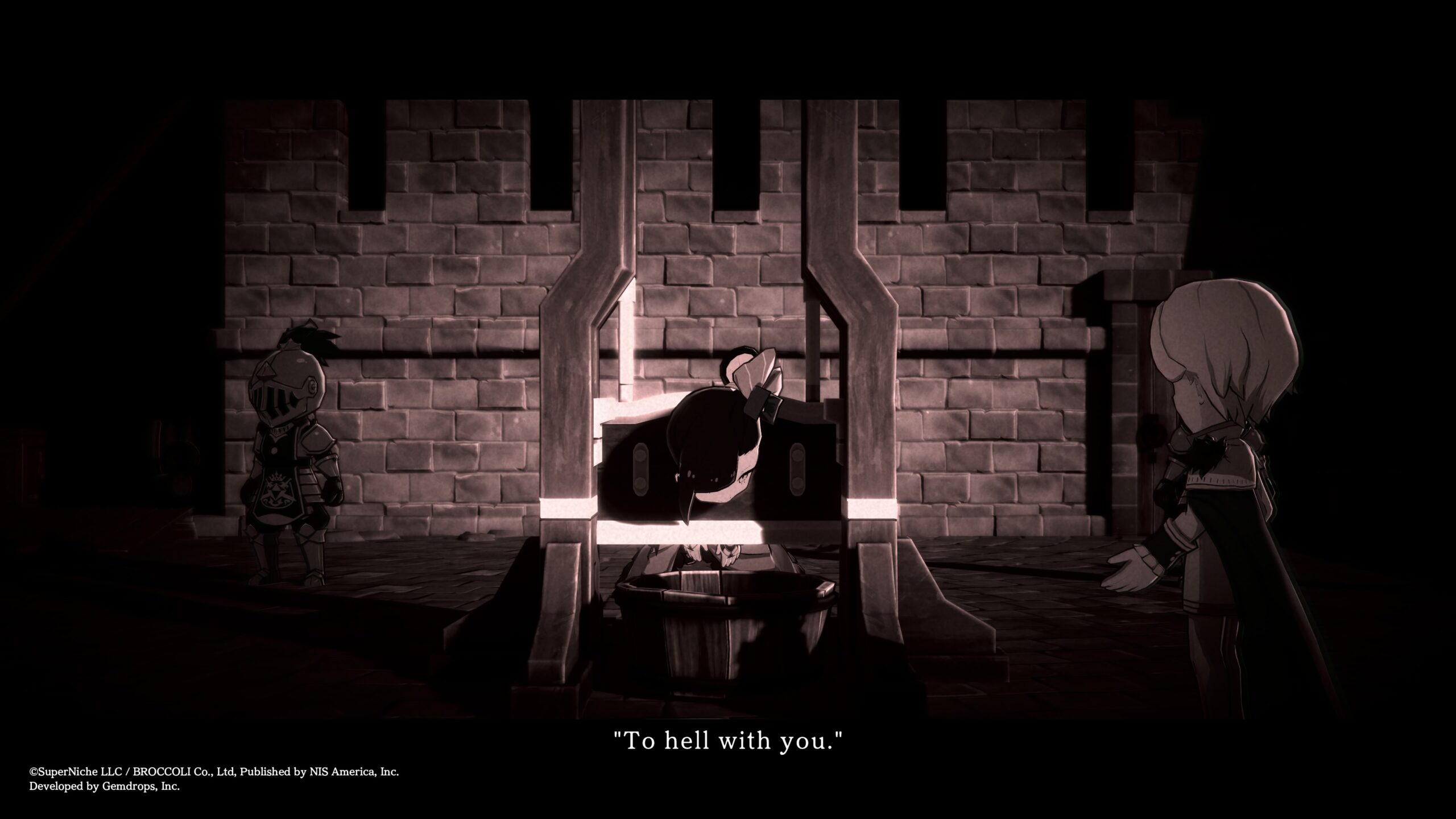 Etrange Overlord throws you right into the thick of things, which is definitely helped by this game not having a main menu. We follow a woman known as Etrange von Rosenburg and the first scene we see is…of her execution. Which her own fiance, the Crown Prince, condemned her to. The Crown Prince who she was engaged to before it was broken off. And the very same Crown Prince whose last words to Etrange (and possibly the last words said to her) is the first line we hear.